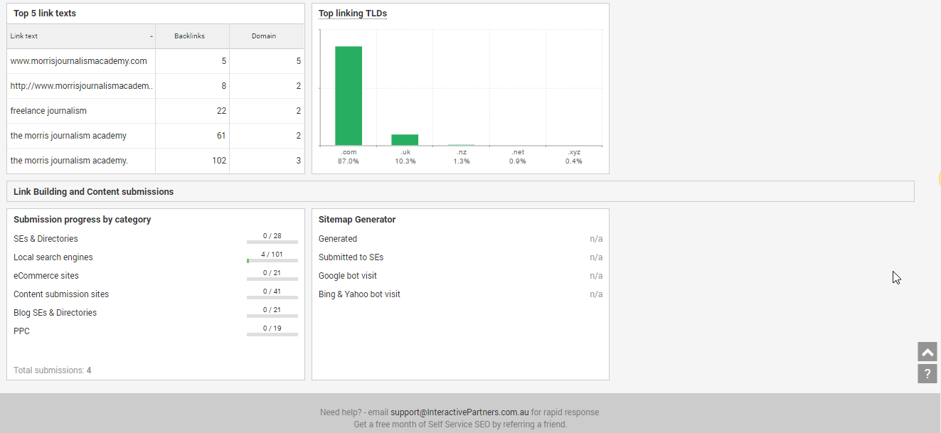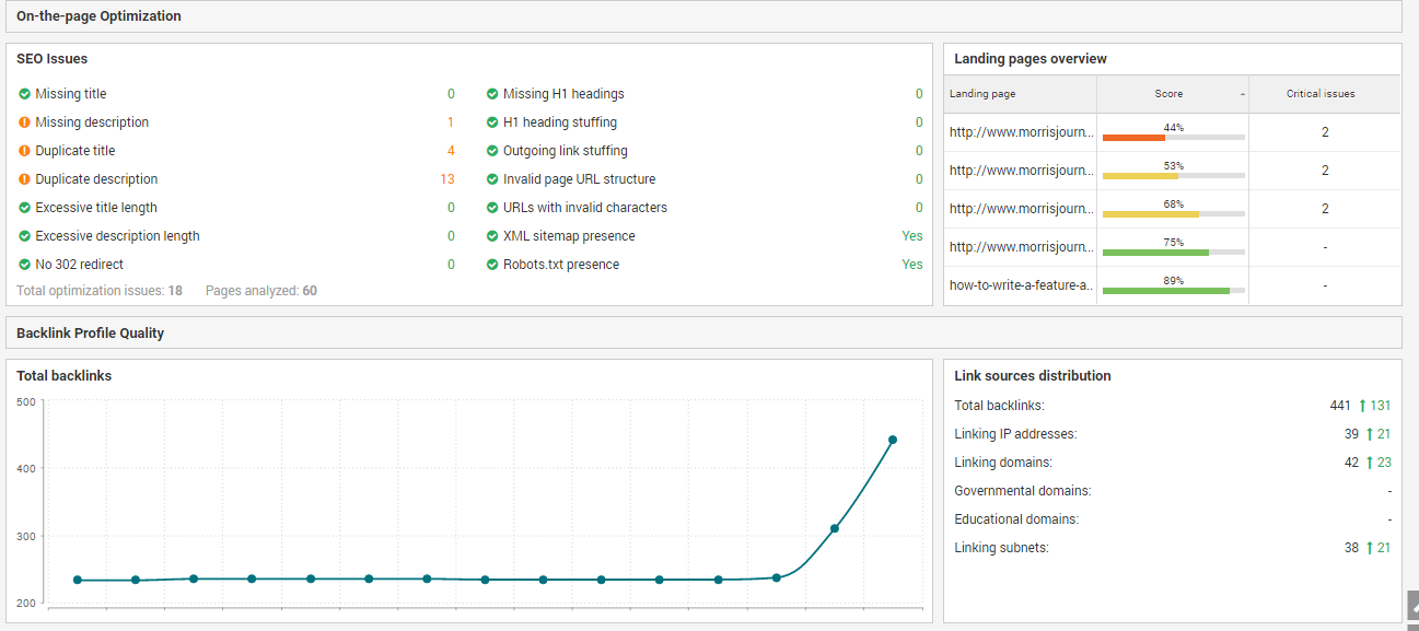 3. Site Optimisation issues are reported along with individual guidelines for specific landing pages. Follow the supplied recommendations for resolution. See your backlinks status, link sources and recent movements up or down.